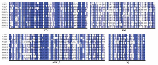 The Batch Web CD-Search Tool was used to search the sequential conservative domain, and then TBtools (Chen, C.J.; Guangzhou, China) [51] software was used for graphical display. The conserved motifs of CAMTA family genes were predicted by MEME (https://meme-suite.org/meme/) (accessed on 25 April 2022) online service and visualized by TBtools software.
