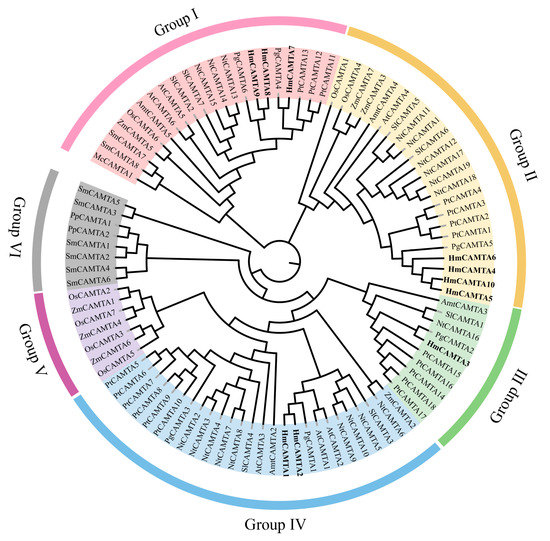 Jalview was used to perform multiple sequence alignment on 10 HmCAMTA and 6 AtCAMTA proteins. To determine whether and where conserved protein domains exist. Four conserved domains of the CAMTA protein are depicted in Figure 4. In order to understand the evolution of HmCAMTA transcriptional activator family, phylogenetic evolutionary trees were constructed based on CAMTA protein sequences in A. thaliana, Oryza sativa, N. tabacum, P. granatum, Zea mays, Solanum lycopersicum, P. trichocarpa, Micromonas commoda, Amborella trichopoda, Physcomitrella patens and Selaginella moellendorffii. The number of CAMTA proteins in these species was 6, 7, 19, 6, 7, 7, 18, 1, 4, 2 and 8, respectively, as shown in Figure 5. In addition, protein names, accession numbers, and protein lengths of CAMTA family members of the above species were shown in Table S1. The 95 CAMTA proteins were divided into 6 branches (Group I to Group VI), and HmCAMTA was distributed into 4 branches (Group I to Group IV). Among them, HmCAMTA1 and HmCAMTA2 were distributed in Group IV HmCAMTA3 was isolated in Group III, followed by HmCAMTA7, HmCAMTA8, and HmCAMTA9 in Group I, and HmCAMTA4, HmCAMTA5, HmCAMTA6, and HmCAMTA10 in Group II. Figure 5 showed that all HmCAMTA proteins clustered with the CAMTA family of P. granatum. And both H. myrtifolia and P. granatum belong to the order Myrtales. Therefore, it was speculated that HmCAMTA was closely related to the CAMTA family in P. granatum. Interestingly, Group V consists only of monocotyledonous species, with bryophyte and fern clustered on Group VI. These results suggest that Group V may be a gene specific to monocot plants such as Z. mays and O. sativa, and Group VI may be a gene specific to bryophytes and ferns.