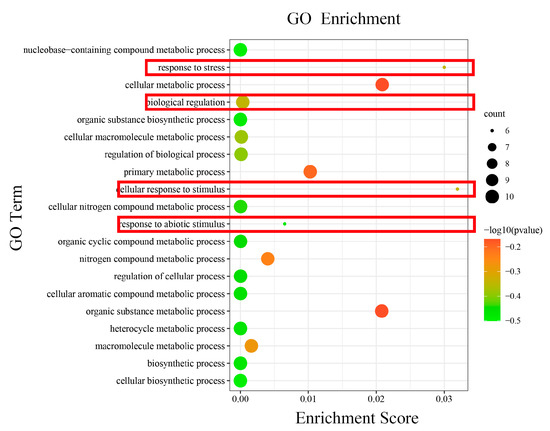 The GO terms enriched of HmCAMTA genes. The black circles indicate the number of target genes and different colors indicate the p-value. The red boxes represent functions related to drought stress.