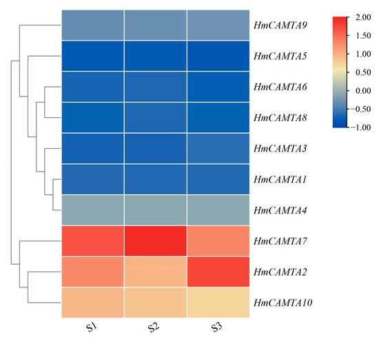 Heatmap expression of HmCAMTA genes under drought stress in transcriptome data (S1): Soil water content ranged from 65% to 75%; (S2): Soil water content ranged from 30% to 45%; (S3): Soil water content ranged from 5% to 15%. After homogenization, the value of expression appears in the heatmap, with red representing high expression and blue representing low expression.