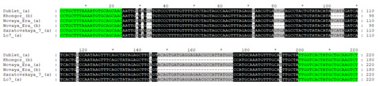 Primers were designed using Primer-BLAST (NCBI) and their specificity was preliminary tested based on the alignment between rye and wheat homologous genes. The expected amplicon size is 220 bp for ScGrf3-2Ra (Saratovskaya 7, Dublet) and 180 bp for ScGrf3-2Rb (Novaya Era, Khongor). Conditions for PCR amplification are shown in the Materials and Methods section. The observed results of testing STS marker on plant material were consistent with those expected (Figure 2).