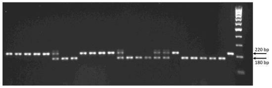 Application of the allelic-specific STS marker for the ScGrf3-2R gene. An example of electrophoresis of PCR products amplified from DNA of spring triticale F3 plants of the hybrid combination Dublet x Valentin 90. M-100-5 (ZAO Sintol, Moscow, Russia) was used as a molecular weight marker. Expected amplicon sizes: 220 bp for ScGrf3-2Ra, 180 bp for ScGrf3-2Rb.