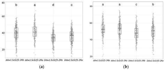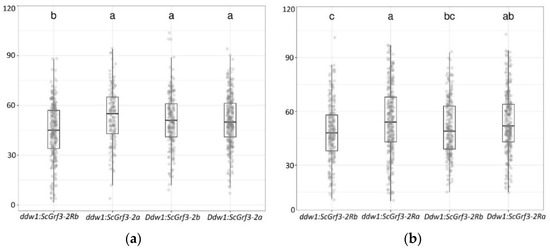 Grain number per main spike (pieces) in recombinant triticale lines with different combinations of Ddw1 and ScGrf3-2R alleles in 2018 (a) and 2019 (b). Letters denote significantly different groups at a significance level of 0.05 according to Tukey’s test. The rectangles show the interval between the 1st and 3rd quartiles, the vertical lines show the maximum and minimum values, the horizontal line inside the rectangle indicates the median, dots show the trait values of individual plants.