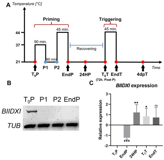 BIIDXI expression during thermotolerance and thermomemory. (A) Schematic representation of the protocol (based on Olas et al. [29]). Seedlings were collected and frozen immediately at the beginning and at the end of priming (T0P and EndP), 24 h after the end of priming (24HP), 72 h after priming/start of triggering (T0T), at the end of triggering (EndT), and 4 days after triggering (4dpT). (B) BIIDXI expression within the priming, including sublethal heat treatment (C) on the BIIDXI expression level during triggering. The expression values are relative to T0P expression. Error bars indicate S.D. (n = 4). Statistical analyses were performed using Student’s t-test. Asterisks indicate statistically significant differences to T0P (* p < 0.05, ** p < 0.01, *** p < 0.001, ns, not significant).