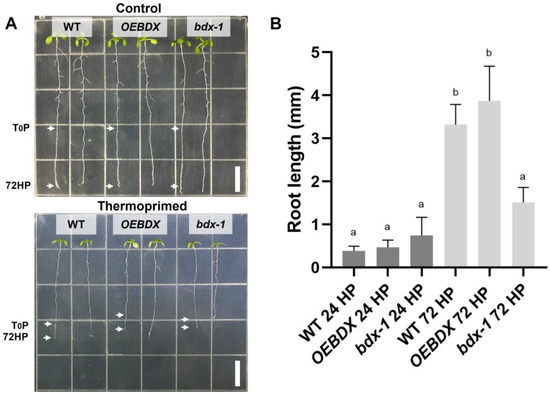 To further investigate the effect of priming on seedling development and because of previous reports indicating that root growth is reduced in seedlings grown at 30 °C for 3–4 days [30], we determined the root length of thermoprimed seedlings. We observed that heat reduced root growth in WT, OEBDX, and bdx-1, but the length of the bdx-1 roots after the thermopriming was significantly reduced, with respect to the treated WT and OEBDX lines. At 24 h after priming (24HP), no difference in root length between lines was observed; at 72 h after priming (72HP), there was a significant increase in root length that was not observed in bdx-1 roots (Figure 3). These results suggest that BIIDXI is involved in thermotolerance acquisition.