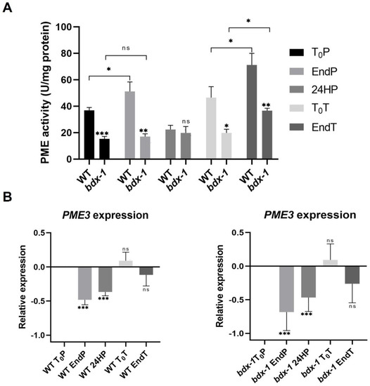 In general, it has been described that the expression levels of different PME isoforms decrease in response to heat shock or thermopriming treatment [13]. AtPME3 expressions in response to priming and triggering in WT and bdx-1 seedlings exhibit similar dynamics (Figure 4B). The AtPME3 expression decreased because of priming until after 24 h. At 72 h of treatment, the expression levels had recovered, and the triggering treatment did not affect this expression level.