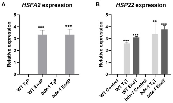 It has been proposed that PMEs and consequently, cell wall remodeling in response to heat shock, could activate the signaling pathway involved in heat shock response [3]; thus, we determined the expressions of HSFA2 and HSP22 during priming and triggering treatments on the WT and bdx-1 lines. HSFA2 expression increased markedly in both lines in response to priming (Figure 5A). HSP22 expression increased in response to priming in both lines and remained at high levels up to 72 h after treatment. Triggering slightly promoted expressions in the WT and bdx-1 lines (Figure 5B).