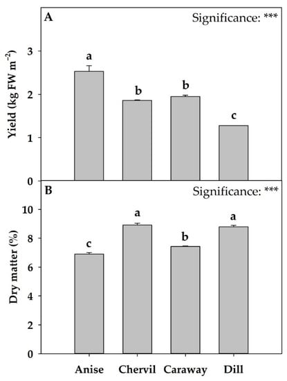 Yield (A) and dry matter percentage (B) of four Apiaceae microgreens grown under controlled environment. *** indicates the significance at p ≤ 0.001. Significant differences based on Tukey’s HSD test are indicated by different letters placed above each vertical bar (p = 0.05). All data are expressed as mean ± standard error, n = 3. Pimpinella anisum L.: Anise; Anthriscus cerefolium: Chervil; Carum carvi: Caraway; and Anethum graveolens: Dill. FW: fresh weight.