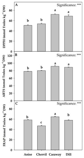 Antioxidant activity DPPH (A), ABTS (B), and FRAP (C) of four Apiaceae microgreens grown in controlled environmental conditions. *** indicates significance at p ≤ 0.001. Significant differences based on Tukey’s HSD test are indicated by different letters placed above each vertical bar (p = 0.05). All data are expressed as mean ± standard error, n = 3. Pimpinella anisum L.: Anise; Anthriscus cerefolium: Chervil; Carum carvi: Caraway; and Anethum graveolens: Dill. DW: dry weight.