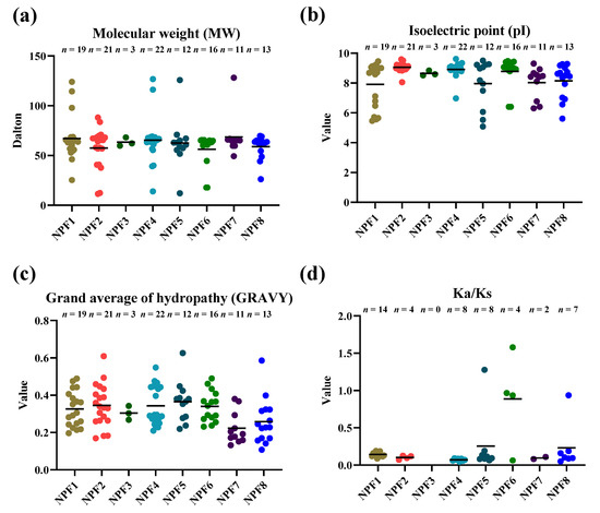 Molecular characterization of the NtNPF proteins in Nicotiana tabacum: (a) molecular weight; (b) theoretical isoelectric point; (c) grand average of hydropathy; (d) non-synonymous substitution rate (ka)/synonymous substitution rate (ks) ratios.