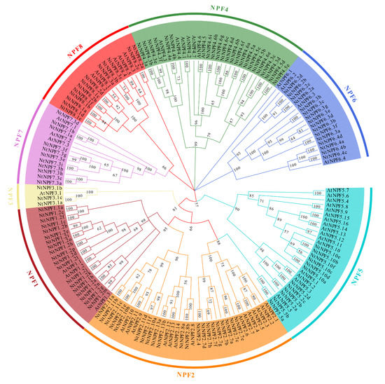 To evaluate the evolutionary relationship between the NPF families of A. thaliana and N. tabacum, we constructed an unrooted phylogenetic tree including 53 AtNPFs and their orthologs in tobacco using the neighbor-joining (NJ) method with MEGA7.0 software. The results showed that the 117 identified NtNPFs were clustered into eight subfamilies (NPF1-NPF8) according to the percentage of homology between A. thaliana and N. tabacum NPF proteins (Figure 2). Each NPF subfamily ranged in size from three to 22, with an average of over 14 homologs (Figure 2, Table S1). The largest number of members belongs to the NtNPF4 subfamily, which is followed by NtNPF2, NtNPF1, and NtNPF6. On the other hand, the NtNPF3 subfamily has the least amount. The variation in the number of the NPF subfamily might indicate various NPF expansion patterns during the evolution of N. tabacum. The phylogenetic tree of A. thaliana and N. tabacum identified some NtNPFs that were closely related to AtNPFs, indicating similar physiological functions in nitrate uptake and transport.