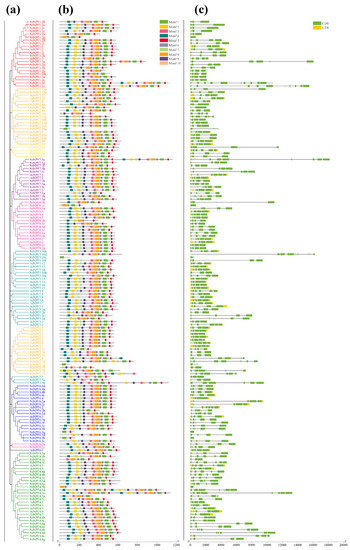 Phylogenetic relationships, architecture of conserved protein motifs, and gene structure of the NtNPF genes in Arabidopsis thaliana and Nicotiana tabacum: (a) the NtNPF phylogeny; (b) the distribution of conserved protein motifs, where each motif is represented by a specific color; (c) CDS and UTR which are indicated as green and yellow boxes, respectively. The lengths of each exon and intron can be mapped to the scale given at the bottom.