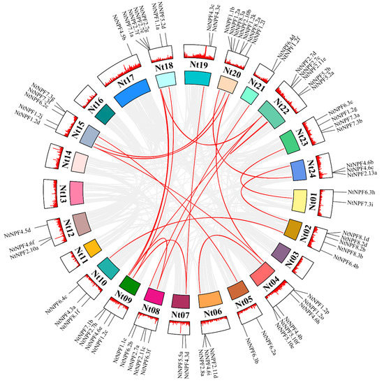 Chromosome distribution and collinearity of the NtNPF genes in Nicotiana tabacum. The gray lines in the background indicate all the syntenic blocks in the N. tabacum genome, and the red lines indicate syntenic NPF gene pairs.