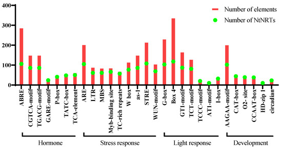 Identification of the cis-regulatory elements in the 2 kb promoter regions of the 117 NtNPF genes. The cis-acting elements were mainly categorized into development, hormone, light response, and stress response-related elements. The bar graph indicates the total number of each cis-acting element found in NtNPF promoters (red box) as well as the number of NtNPF genes which include a specific cis-regulatory element (green circle).