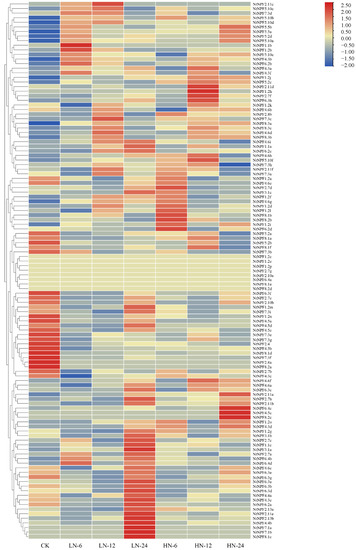 The hierarchical cluster heat map showing NtNPF gene expression levels in tobacco root. The seedlings of tobacco were cultivated in a hydroponic system. Plants with approximately 10 cm of leaves in length and with similar sizes were used for nitrate treatments, including high (HN) and low (LN) nitrate concentrations. The root samples were harvested at different time points, including 0 (CK), 6, 12, and 24 h. Three biological replicates for each subgroup were applied.