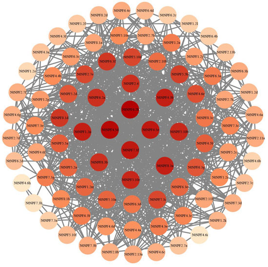 Co-expression networks of NtNPF family genes. Cycle nodes represent genes, and the size of the nodes indicates the strength of the node interrelationship by degree value. The intensity of the interactions between two genes is represented by the width of the lines connecting two nodes. The hub NtNPF genes are located in the network’s center.