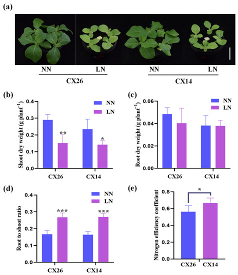 Growth responses of the two cigar tobaccos to two nitrogen levels: (a) growth performance of CX14 and CX26 under two treatments; (b) shoot dry weight; (c) root dry weight; (d) root/shoot ratio; (e) nitrogen efficiency coefficient. Data represents means ± SD (n = 5). A significant difference between CX14 and CX26 under each treatment is indicated by Duncan’s method (*p < 0.05, **p < 0.01, ***p < 0.001).