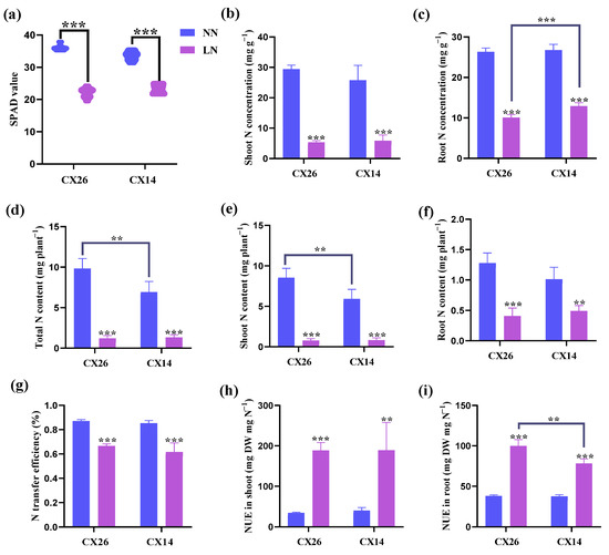 We then examined the leaf SPAD value, N concentration, N content, and NUE in shoot and root of the two cultivars to further assess the effects of N uptake and utilization. The results showed that the leaf SPAD values of the two cultivars decreased significantly by 38.6% (CX14) and 30.6% (CX26) under N-stress conditions compared with those under N-sufficient conditions (Figure 9a). Under LN treatment, N concentrations in both the shoot and root of the two cultivars are lower than under NN treatment (Figure 9b,c). Notably, CX14 had a higher N concentration in roots under LN conditions compared with CX26 (Figure 9c). However, the shoot N content and total N content of CX26 were 44.8% and 42.1% higher than that of CX14 under NN conditions, respectively (Figure 9d,e). Similarly, the N transfer efficiency of CX26 and CX14 decreased by 23.5% and 27.8% under N-stress conditions compared with that under N-sufficient conditions, respectively (Figure 9g). We then calculated the NUE in the shoot and root of the two varieties. The NUE of both cultivars under the LN condition was significantly higher than that under the NN condition (Figure 9h,i). Moreover, the NUE in the root of CX26 was significantly higher than that of CX14 under N-deprivation conditions, but no difference was observed in the shoot (Figure 9h,i).