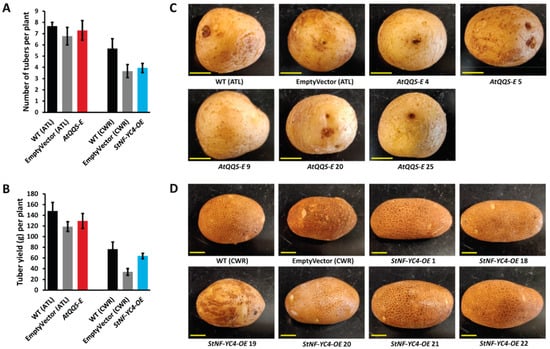 2.1. No Significant Difference Was Observed in Tuber Yield, Number, and Appearance in AtQQS-E and StNF-YC4-OE Potato Plants vs. Wild-Type Control