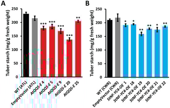 2.4. Ectopic Expression of AtQQS and Overexpression of StNF-YC4 in Potatoes Reduces Starch Accumulation in the Tubers