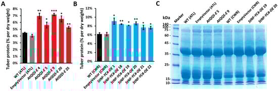2.5. AtQQS-E and StNF-YC4-OE Potato Plants Have Higher Protein Accumulation in the Tubers