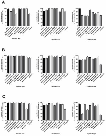 The reactions of Tenebrio molitor (A), Tribolium confusum (B), and Acanthoscelides obtectus (C) to chemical products (DEET and 2-undecanone) and essential oils (Ocimum basilicum, Eucalyptus globulus, Lavandula angustifolia, Pinus sylvestris, Curcuma oblonga, Alium sativum, and Artemisia annua) in comparison to control group. Significant differences are marked with an asterisk (*). The order of the graphs determines the concentrations used in the experiments (1%; 0.1% and 0.01%). Means of attracted individuals are pictured.