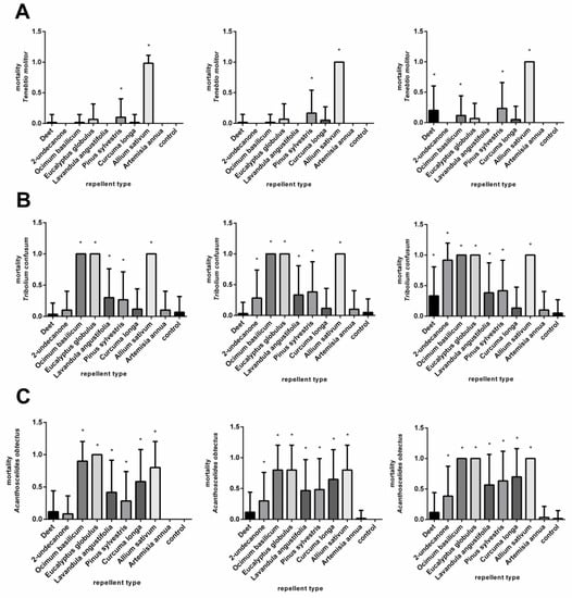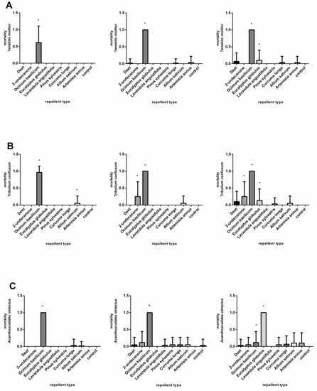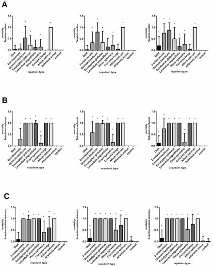 Mortality of Tenebrio molitor (A), Tribolium confusum (B), and Acanthoscelides obtectus (C) after using chemical products (DEET and 2-undecanone) and essential oils (Ocimum basilicum, Eucalyptus globulus, Lavandula angustifolia, Pinus sylvestris, Curcuma oblonga, Alium sativum, and Artemisia annua) at a concentration of 3.7 µL/cm2 in comparison to control group. Significant differences are marked with an asterisk (*). The order of the graphs determines the incubation time (24, 48, and 72 h) after application. Each column shows mean of dead individuals and SD.