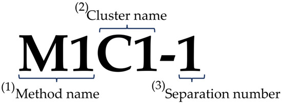 We first report the results for each relationship in tables provided for the machine-based cluster. As briefly explained in Figure 1, we named the relationship of each group. That is, (1) method name, (2) cluster name, and (3) separation number. The method and cluster are present in this case, but since one method depends on another, it must be separated again. If the threads M1C1-3 and M3C1 match M3C1 and M4C3 in Figure 2a, it means that M1C1-3 is connected to M1C1 three times. In addition, M1C1 and M2C1-2 match with M2C1-2 and M4C3 in Figure 2b. Figure 2d shows the correspondence between M1C2 and M3C1 and M2C2 and M3C3. Therefore, this relationship can be considered as a cluster image of comparable threads.