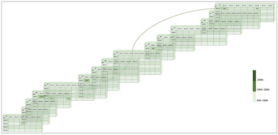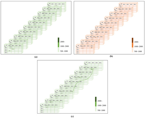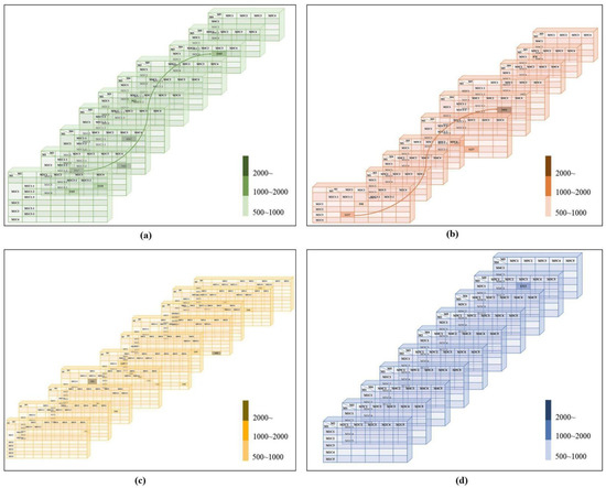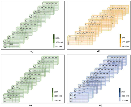 Figure 2b shows that the numerical value for identical M2C3-1 and M3C1 and M2C3-2 and M3C2 ranges from 1120 to 1127. Moreover, the numerical value for identical models, M2C1 and M2C1-1, M2C2 and M3C1-2, M2C3 and M2C1-1, M2C4 and M3C2-2, M2C5 and M3C3, M2C5 and M3C6, M4C1 and M5C4-1, M4C5 and M5C1-2, M4C6 and M5C1-2′s in Figure 2c ranges from 1120 to 1127. Therefore, these images can be considered identical. However, there is no relationship in Figure 2c,d. In Figure 2d, only a relation of 1312 is shown.