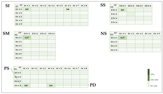For identical: M2C2 and M3C1-1, M2C2-3 and M3C2-1, M2C3-1 and M4C6-1, M2C5-1 and M4C4, M2C5-2 and M4C5, M2C2 and M3C1-2, M2C1 and M5C5, M2C2 and M3C1-2, M2C2-4 and M5C2, and M2C3-2 and M4C2 in Figure 4b. Moreover, the values of M2C2-2 and M3C1-1, M2C2-3 and M3C2-1, M2C3-2 and M4C6-2, M2C5-1 and M4C4, M2C5-2 and M4C5, M2C2-1 and M5C5, M2C2-4 and M5C2, and M3C2-2 and M4C2 are between 911 and 912, which means that they are very similar images. For Figure 4a,c, there is no relation and similar values, only 4d shows at least one relation.