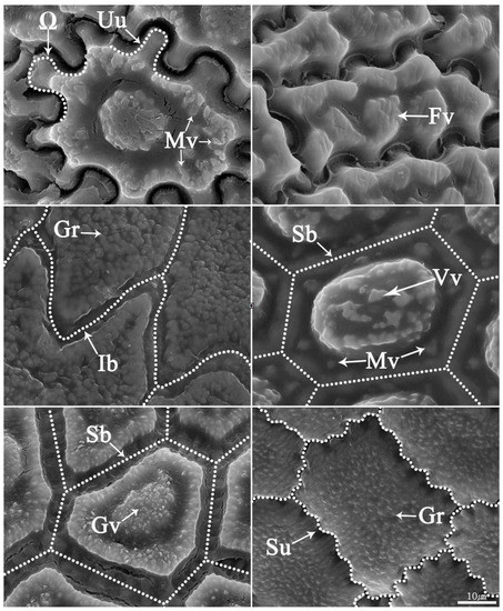 - Barthlott, W. Scanning electron microscopy of the epidermal surface in plants. In Scanning Electron Microscopy in Taxonomy and Function Morphology; Claugher, D., Ed.; Clarendon Press: Oxford, UK, 1990; Volume 41, pp. 69–94. [Google Scholar]