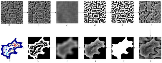 Data preprocessing of the seed coat pattern. (a) Input image, (b) grayscale image, (c) threshold using adaptive thresholding, (d) binary image, (e) labeled image (f) and cropped image, (g) separated cropped image, (h) masked image, (i) grayscale image, (j) binary image obtained using an adaptive threshold, (k) binary image, (l) and colored image.