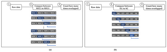 Figure 12a shows a comparison between the methods used to analyze relationships. In this section, we explain how we use this algorithm. First, we read the test image of the raw data for performance analysis. Then, we compare the results of the methods we find related. For example, it would be useful to compare M1C1 and M1C2, M1C1 and M1C3, and M1C1 and M1C4 as shown in Figure 12a. This process will be completed after M5C4. Thereafter, the number of times overlapping values occurred is recorded. Figure 12b illustrates the main analysis. It is the same process as before. However, the comparison procedure is different from that represented in Figure 12a. The difference is that we used the elbow and silhouette method to determine the number of clusters required. We found several types of clusters. Therefore, we compared EG and SC, EG and ET, EG and ST, EG and EC, EG and SC.