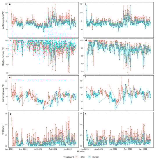 Climatic parameters throughout the experiment, daily mean values of air temperature (°C), relative humidity (%), soil temperature (°C), and pressure deficit of environmental value-DPV (kPa) in the two study areas. (a,c,e,g) conserved area and (b,d,f,h) intervened area, subjected to passive warming in the OTC treatment (red) and without passive warming in the control treatment (blue).