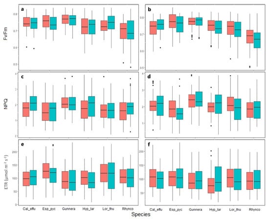 Chlorophyll a fluorescence parameters in páramo plants in two study areas. Conserved area (left) and intervened area (right), subjected to passive warming in the OTC treatment (red) and control without OTC (blue). Pooled data for all seasons, n = 58, p > 0.05. Cal_effu = Calamagrostis effusa, Esp_pyc = Espeletia pycnophylla, Gunnera = Gunnera magellanica, Hyp_lar = Hypericum laricifolium, Lor_thu = Loricaria thuyoides, Rhynco = Rhynchospora macrochaeta. Fv/Fm Maximum quantum efficiency of photosystem II (a,b), NPQ non-photochemical quenching (c,d), and ETR Electron transport rate (e,f). The black points are outliers.