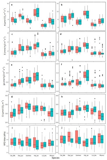 Gas exchange parameters in páramo plants in the conserved area (left) and intervened area (right), subjected to passive warming in the OTC treatment (red) and plots without passive warming in the control treatment (blue). Pooled data for all seasons, n = 75, p > 0.05. Cal_effu = Calamagrostis effusa, Esp_pyc = Espeletia pycnophylla, Gunnera = Gunnera magellanica, Hyp_lar = Hypericum laricifolium, Lor_thu = Loricaria thuyoides, Rhynco = Rhynchospora macrochaeta. Net photosynthesis (a,b), Transpiration (c,d), Stomatal conductance (e,f), Intercellular CO2 concentration (g,h), and Leaf vapor pressure deficit (i,j). The black points are outliers.