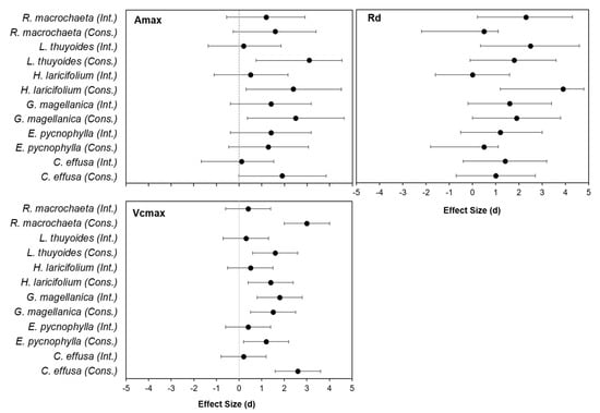 Respiration rates also increased in response to warming for the species L. thuyoides from the intervened area (d = 2), for R. macrochaeta from the intervened area (d = 2.3), and for H. laricifolium (d = 3.9) from the conserved area.