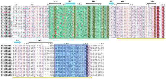 Multiple sequence alignment of all deduced tomato PLATZ polypeptides with that of Arabidopsis. The green box highlights the first conserved region [C-x2-H-x11-C-x2-C-x(4–5)-C-x2-C-x(3–5)-H-x2-H] and the blue box marks the second conserved region [C-x2-C-x(10–12)-C-x3-C], which are essential for zinc-dependent DNA binding. The yellow underline indicates the location of the PLATZ domain. The elements of the secondary structure determined using the ESPript 3.0 web server are represented by gray bars (α-helices) and blue-green arrows (β-strands) above the alignment.