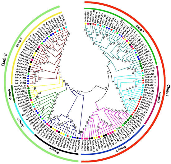 Our phylogenetic analysis divided the PLATZ proteins from various plant species into two major clades (Figure 2). Of these clades, only clade I contained the PLATZ homologs from the green alga Chlamydomonas reinhardtii, suggesting that the proteins from clade I, especially groups 2 and 3, may be more primitive compared with those from clade II, and they might have evolved before the divergence of chlorophytes and streptophytes over one billion years ago [43]. The phylogenetic groups 4, 5, and 7 of clade II contained solely clusters of PLATZ homologous proteins from angiosperms, suggesting that the corresponding proteins from these groups might have arisen before the monocot–dicot split occurred (~200 million years ago) [44]. Intriguingly, group 2 of clade I predominantly consisted of the corresponding proteins from solanaceous crops (tomato and potato) together with the homolog from Arabidopsis (AtPLATZ6) and green alga (CrePLATZ3), suggesting that these members from Arabidopsis and solanaceous crops in group 2 may have emerged from the same progenitor before the divergence of algae and streptophytes. Notably, the tomato PLATZ proteins formed a cluster with their orthologs from potato in groups 1, 4, and 7 with 100% bootstrap support, underlying the evolutionary conservation of these PLATZ members in the solanaceous family.