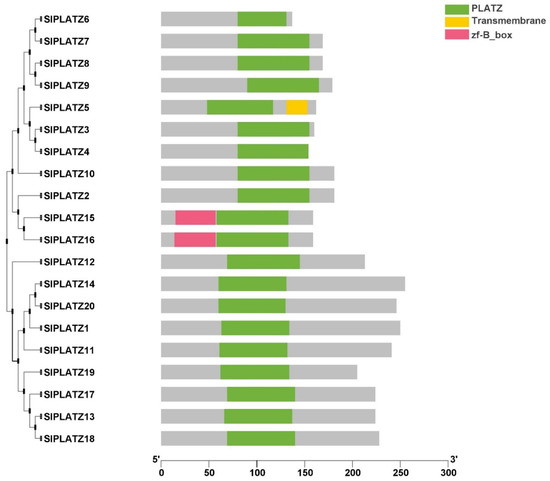 PLATZ proteins are composed of a conserved PLATZ domain with or without additional types of domains. Seventeen out of 20 SlPLATZ proteins comprised only the PLATZ domain, while the remaining three SlPLATZ proteins were composed of the PLATZ domain and an additional domain, viz., the B-box-type zinc finger domain (BBOX) or transmembrane domain (TM) (Figure 3). Among the three proteins having an additional domain, SlPLATZ4 was the only member harboring a TM domain in the rear of the PLATZ domain, while a BBOX domain positioned before the PLATZ domain was predicted in SlPLATZ15 and SlPLATZ16. Analysis of the exon–intron distribution of the SlPLATZ genes indicated that there was no gene lacking an intron in their coding sequences (Figure S1). Except for SlPLATZ5, which contained only one intron, all SlPLATZ genes have between two and three introns. Intriguingly, the paralogous gene pairs in the same clades, such as SlPLATZ15 and SlPLATZ16, shared the identical gene structure in terms of intron number and exon length.