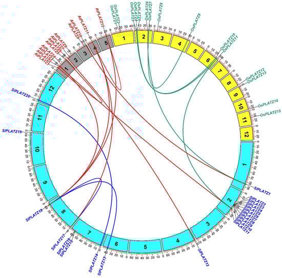 Furthermore, a comparative microsyntenic analysis was performed to investigate the phylogenetic relationship between tomato, Arabidopsis, and rice. No orthologous gene pairs were predicted between rice and Arabidopsis, whereas we identified seven orthologs between tomato and Arabidopsis and two orthologs between tomato and rice, respectively (Figure 4). SlPLATZ18 was orthologous to three PLATZ genes (AtPLATZ3, AtPLATZ11, and AtPLATZ12) from Arabidopsis, while SlPLATZ12 and SlPLATZ17 were orthologous to AtPLATZ6 and AtPLATZ11, respectively. Intriguingly, SlPLATZ1 and SlPLATZ11 were collinear with the PLATZ genes from both Arabidopsis and rice. SlPLATZ1 and SlPLATZ11 were orthologous to AtPLATZ10 and OsPLATZ6, and OsPLATZ11 and SlPLATZ2, respectively.