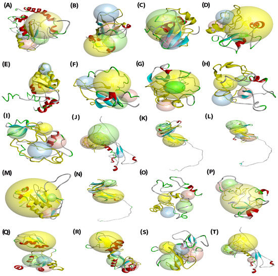 The final 3D modeled structures of SlPLATZ proteins generated using Discovery Studio v.21.1. The components of secondary structure: α-helices (red), β-sheets (cyan), coils (green), and loops (gray) and the four binding sites: site 1 (yellow sphere), site 2 (green sphere), site 3 (red sphere), and site 4 (blue sphere), are displayed in the predicted 3D structures of (A–T) SlPLATZ1–SlPLATZ20.