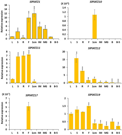 qRT−PCR expression analysis of SlPLATZ genes in various organs. The organs used for the expression analysis are leaves (L), roots (R), stems (S), flowers (F), 1 cm fruits (1 cm), immature fruits (IM), mature green fruits (MG), breaker fruits (B), and fruits 5 days after breaker stage (B5). Error bars indicate the standard deviations of the means of three independent biological replicates. *, **, and *** represent the significant difference between the control samples (leaves) and the samples from the other organs according to Student’s t−test, at p−values <0.05, <0.01, and <0.001, respectively.