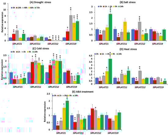 Under heat stress, the expression of SlPLATZ1 initially declined by ~2-fold at 1 h of exposure to high-temperature conditions but recovered at 3 h and subsequently rose (2- to 4-fold) at 9 h and 24 h compared to the control. SlPLATZ11 was downregulated by 2.3-fold at 1 h after heat exposure but significantly upregulated (1.6- to 2-fold) at 3 h and 24 h. Similarly, the transcript accumulation levels of SlPLATZ12 were attenuated (2-fold vs. the control) at 1 h following exposure to a high temperature but rose 2.1-fold at 3 h. On the contrary, SlPLATZ19 was significantly repressed by 1.6- to 3.3-fold at most stages of heat treatment (Figure 7D).