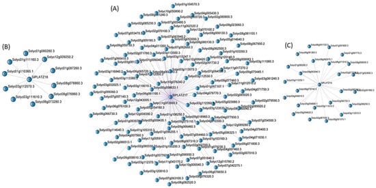 Gene co-expression network analysis of SlPLATZ genes. The co-expressed genes identified in the networks of SlPLATZ17 (A), SlPLATZ18 (B), and SlPLATZ19 (C).