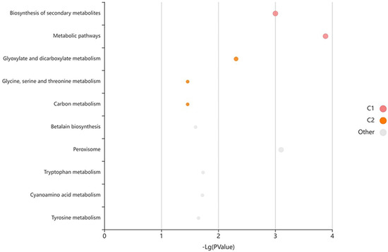WGCNA was conducted to construct the co-expression network of SlPLATZ genes using RNA-seq data (Figure 8). A total of 150 genes were detected in the co-expression networks of SlPLATZ genes. Specifically, 116, 10, and 24 genes were involved in the gene co-expression networks of SlPLATZ17, SlPLATZ18, and SlPLATZ19, respectively. The KEGG enrichment analysis of the co-expressed genes indicated that the co-expressed genes in the network of SlPLATZ genes were implicated in diverse biological pathways, including plant–pathogen interaction, RNA transport, mismatch repair, MAPK signaling pathway, biosynthesis of secondary metabolites, fatty acid biosynthesis, biosynthesis of amino acids, phenylpropanoid biosynthesis, nitrogen metabolism, protein export, and so forth (Figure 9, Tables S11 and S12). However, certain co-expressed genes have not been annotated in any biological process. Intriguingly, SlSHMT2 (Solyc02g091560.3) and a RIN--G finger gene (Solyc08g081370) responsive to multiple abiotic stresses, SnRK1 (Solyc02g067030) and SlZF-31 (Solyc08g063040) associated with abiotic stress tolerance of tomato, a NAC gene (Solyc04g005610) responsive to drought and salinity treatments, an abiotic stress-inducible gene SlGS2 (Solyc01g080280), AHL5 (Solyc08g008030) implicated in the resistance to the oomycete pathogen Phytophthora capsica, and Glutaredoxin (Solyc08g062970) responsive to pathogen infection were co-expressed with the hub gene SlPLATZ19. SlGS2 (Solyc01g080280) inducible by various abiotic stresses, a stress-inducible gene coding for Chaperonin 21 (Solyc12g009250), and SnRK1 (Solyc02g067030) associated with stress tolerance in tomato were also present in the co-expression network of SlPLATZ18. Furthermore, SlPLATZ17 showed co-expression with several abiotic stress-associated genes, such as SlAPRR5 (Solyc03g081240) inducible by seawater stress, SlTLP6 (Solyc04g071750) responsive to osmotic stress, a gene encoding nucleolar protein 6 (Solyc02g085230) inducible by aluminum stress, and low-temperature inducible genes SlGRAS4 (Solyc01g100200) and SlPLDβ1(Solyc08g080130). We also identified several genes inducible by pathogen infection in the co-expression network of SlPLATZ17, such as SlPP2C48 (Solyc06g076100), and genes that codify a GRAS transcription factor (Solyc07g063940), a major latex-like protein (Solyc08g023660), and a leucine-rich repeat receptor-like serine/threonine protein kinase (Solyc11g017270) (Figure 8).