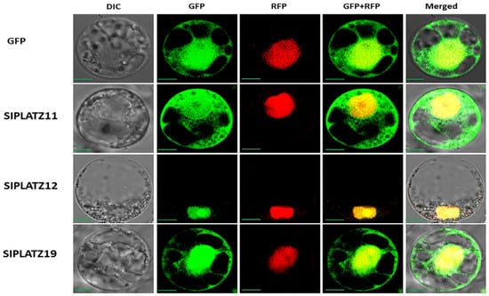 To further explore the functions of SlPLATZ proteins, their subcellular localization was empirically observed under a confocal microscope after the transient expression of the SlPLATZ–GFP fusion proteins in the rice protoplast. The nuclear-specific localization of SlPLATZ12 suggested its specific role in transcriptional regulation as a transcription factor. The localization of SlPLATZ11 and SlPLATZ19 in both the nucleus and the cytoplasm spotlighted the possibility that they might shuttle between the cytoplasm and the nucleus to play a regulatory role in various cellular signaling pathways in addition to their role in gene regulation as transcription factors. Our finding is consistent with the previous studies that reported the localization of PLATZ proteins in the nucleus or the nucleus and cytoplasm [26,39].