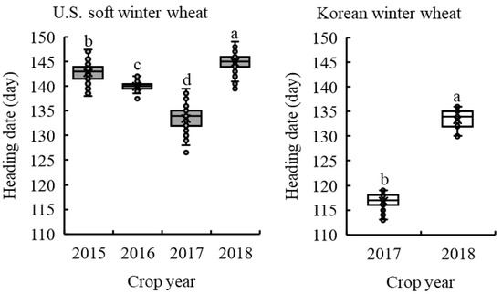 Mean heading dates of 121 eastern U.S. soft winter wheat genotypes grown in 2015–2018 and 32 Korean winter wheat varieties grown in 2017 and 2018 in Wooster, Ohio. x indicates the mean. Means with different letters are significantly different at p < 0.05.