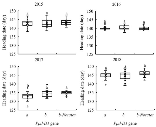 Heading dates of 86 eastern U.S. soft winter wheat genotypes with different alleles at the Ppd-D1 gene in four crop years. b-Norstar, ‘Norstar’-type sensitive allele. x indicates the mean. Means with different letters are significantly different at p < 0.05.