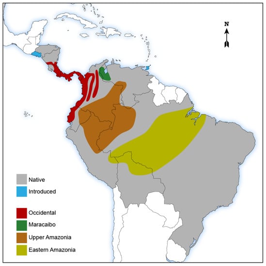 - Clement, C.; Araújo, M.; Coppens d’Eeckenbrugge, G.; dos Reis, V.; Lehnebach, R.; Picanço, D. Origin and Dispersal of Domesticated Peach Palm. Front. Ecol. Evol. 2017, 5, 1–19. [Google Scholar] [CrossRef]